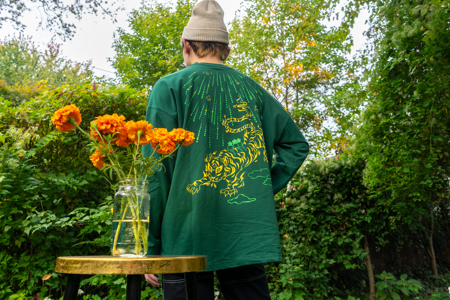 For our fall collection, we wanted to take you to dense forests and walk among bitter mountain herbs to ponder legends of creatures in the realm of the unseen who lend protective powers to humans. Between crooked trunks of pine trees and dappled forest light roam divine guardians in the form of goblins, dragons, and, more often than not, tigers.