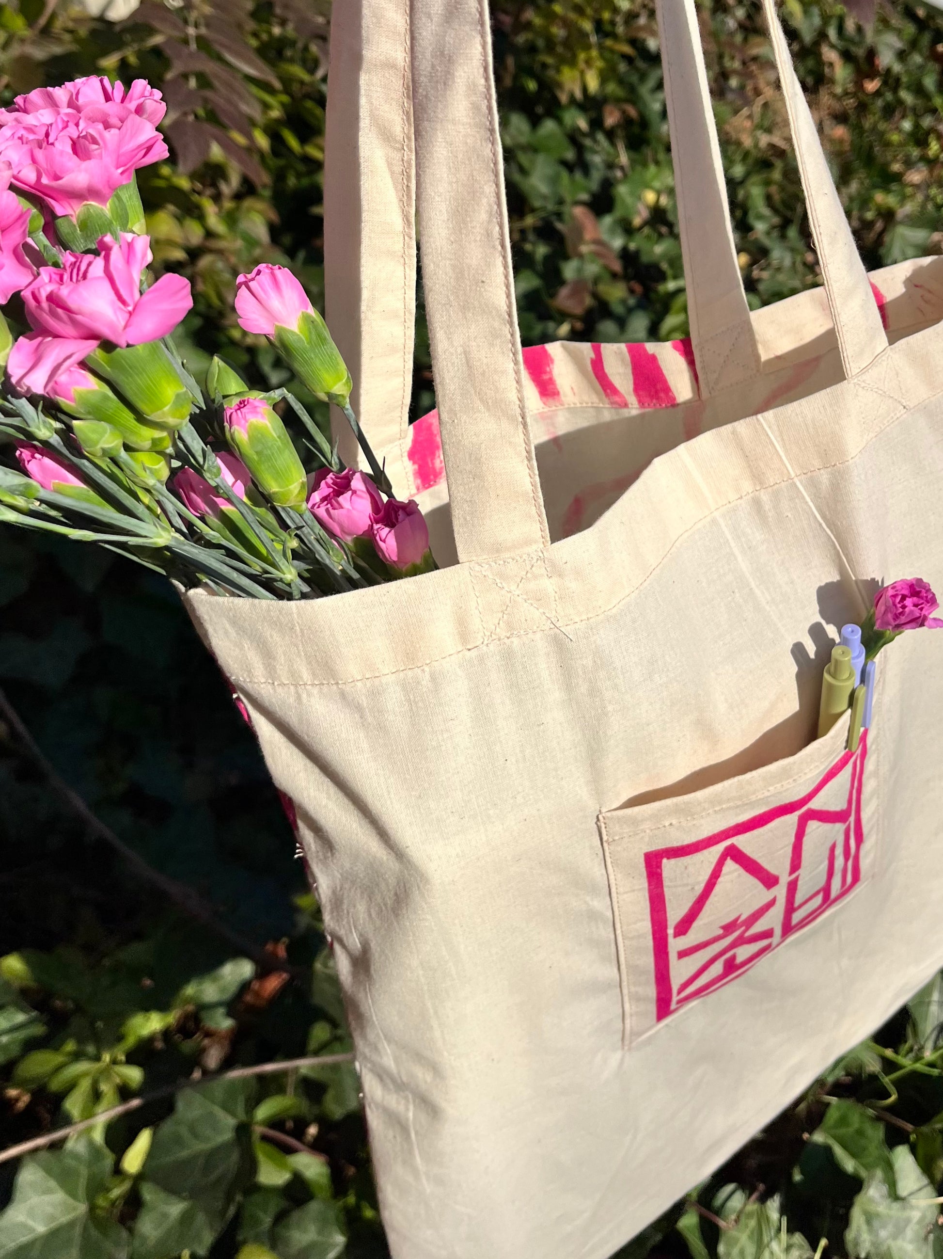 A tote bag for all your everyday essentials, hand block-printed and handsewn by yours truly. Plus, a pocket for little trinkets you pick up along the way.