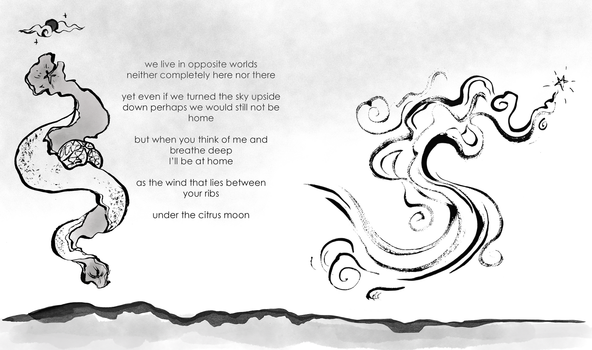 citrus skins is an illustrated story inspired by the Korean folktale, “fairy and the woodcutter” (선녀와 나무꾼). This is our take on the tale as a story of home and longing and how it feels to be complete and incomplete as love (for place, for people, or for ourselves) stretches us out over many geographies.