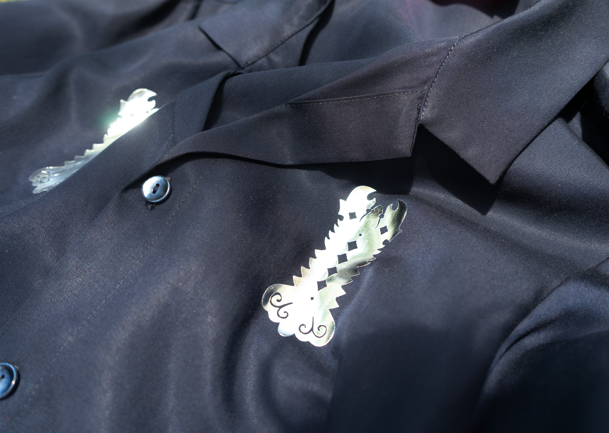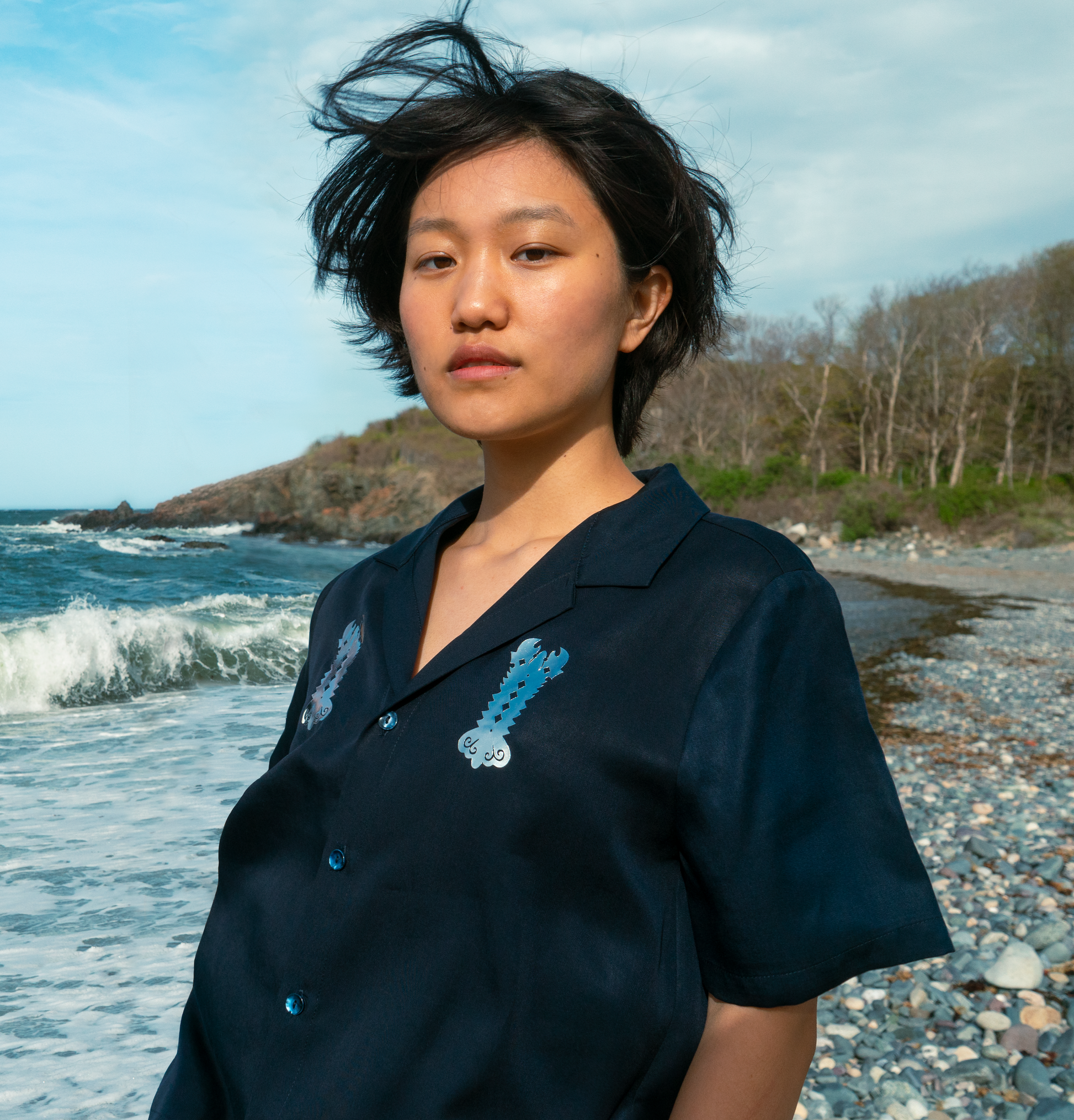 Float Shirt in ink. Embellished with silver crawfish which adorn traditional mother-of-pearl craft and swim among the many treasures of the seas. No one really knows what our mother keeps in her najeonchilgi jewelry box, but we suspect: two Gucci watches from the duty free shop, golden baby rings, one greasy napkin from Johnny Rocket's, and three shells from Virginia beach.