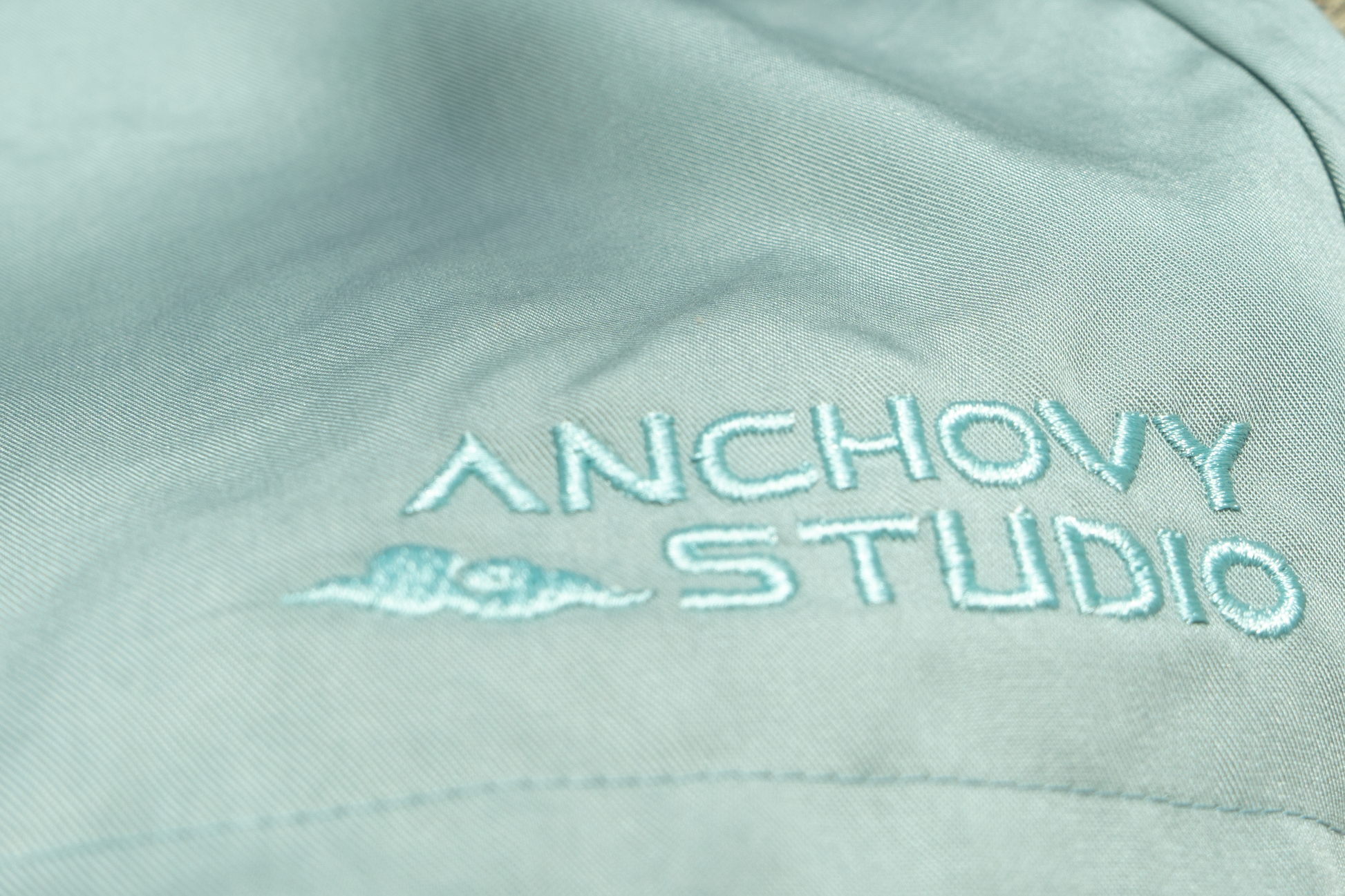 Float Shorts in celadon, embroidered with Anchovy Studio logo. High-waisted fit and straight cut intended to fall around mid-thigh, for extra flattering effect. Flat elastic waistband for ultimate comfiness and, of course, roomy pockets! Flow and luxe heavyweight drape with a light sheen and smooth handfeel.