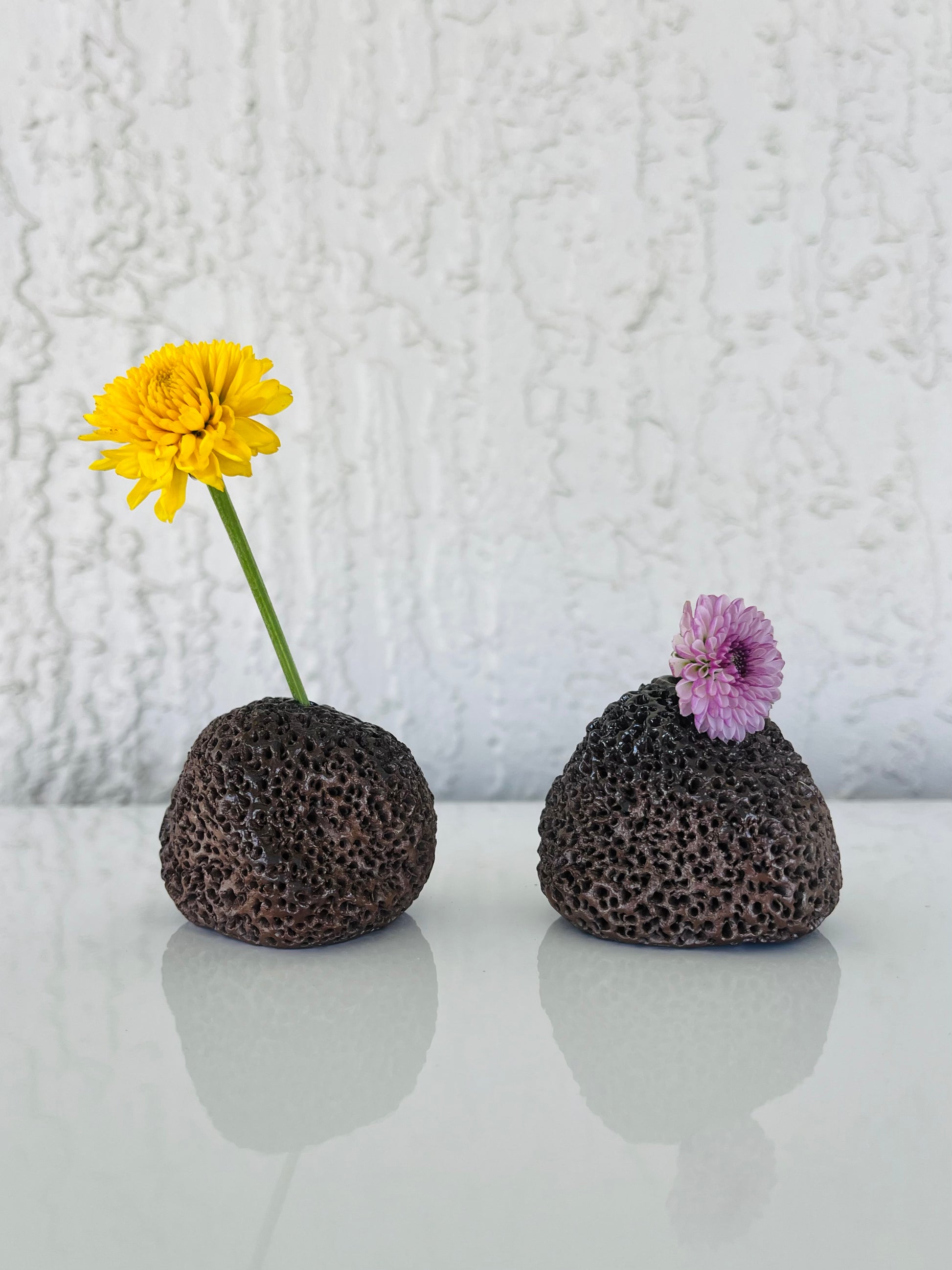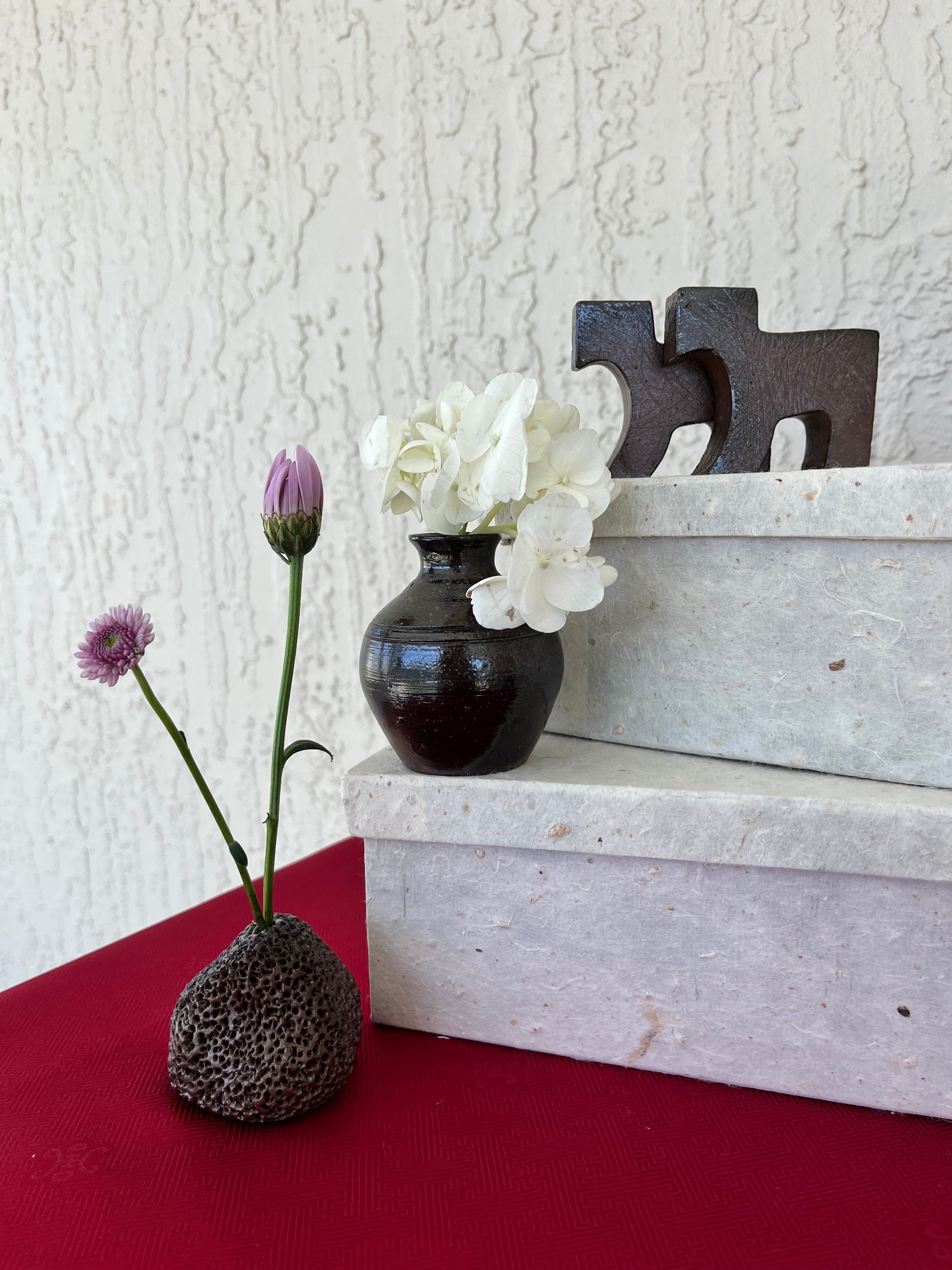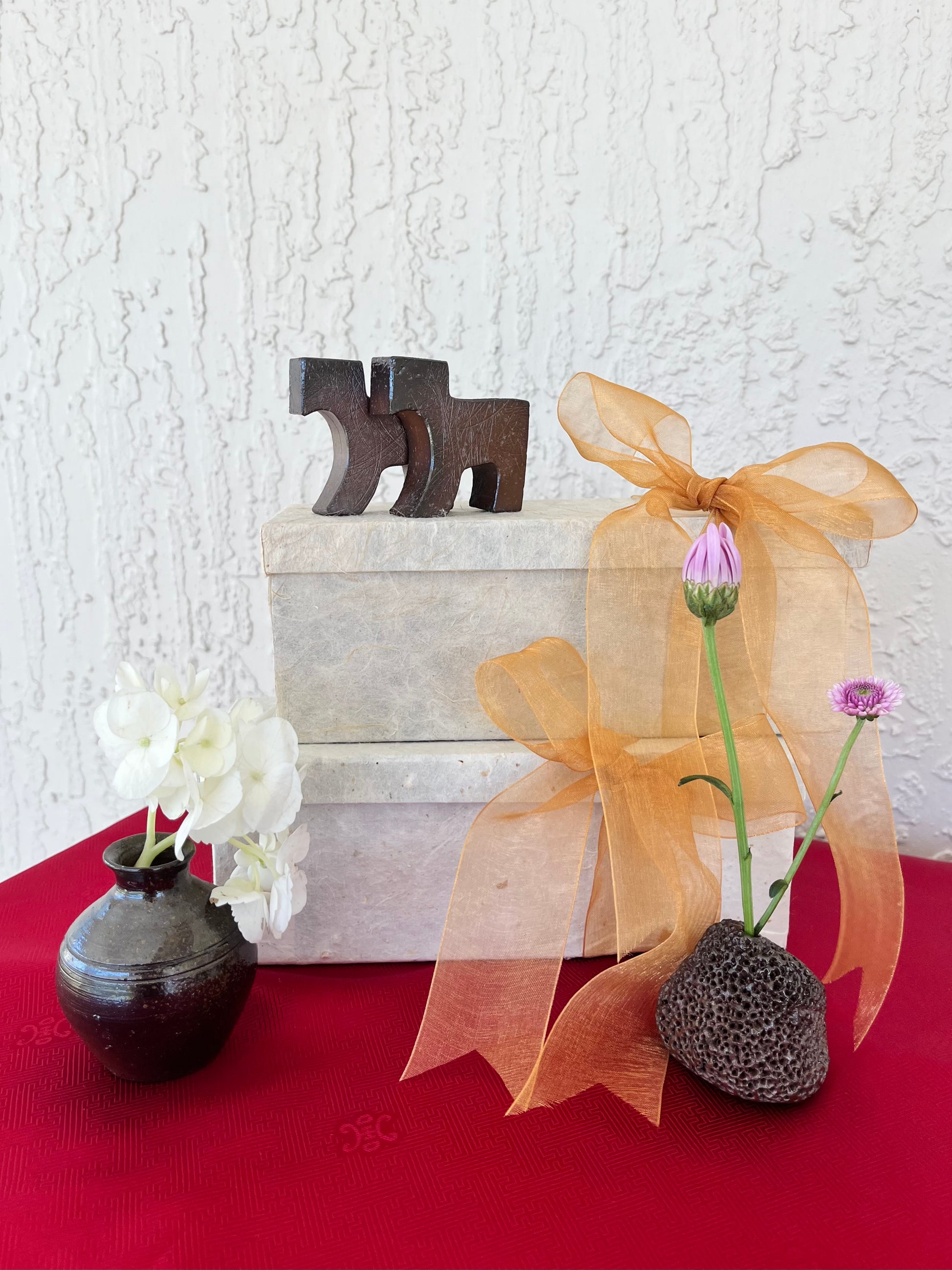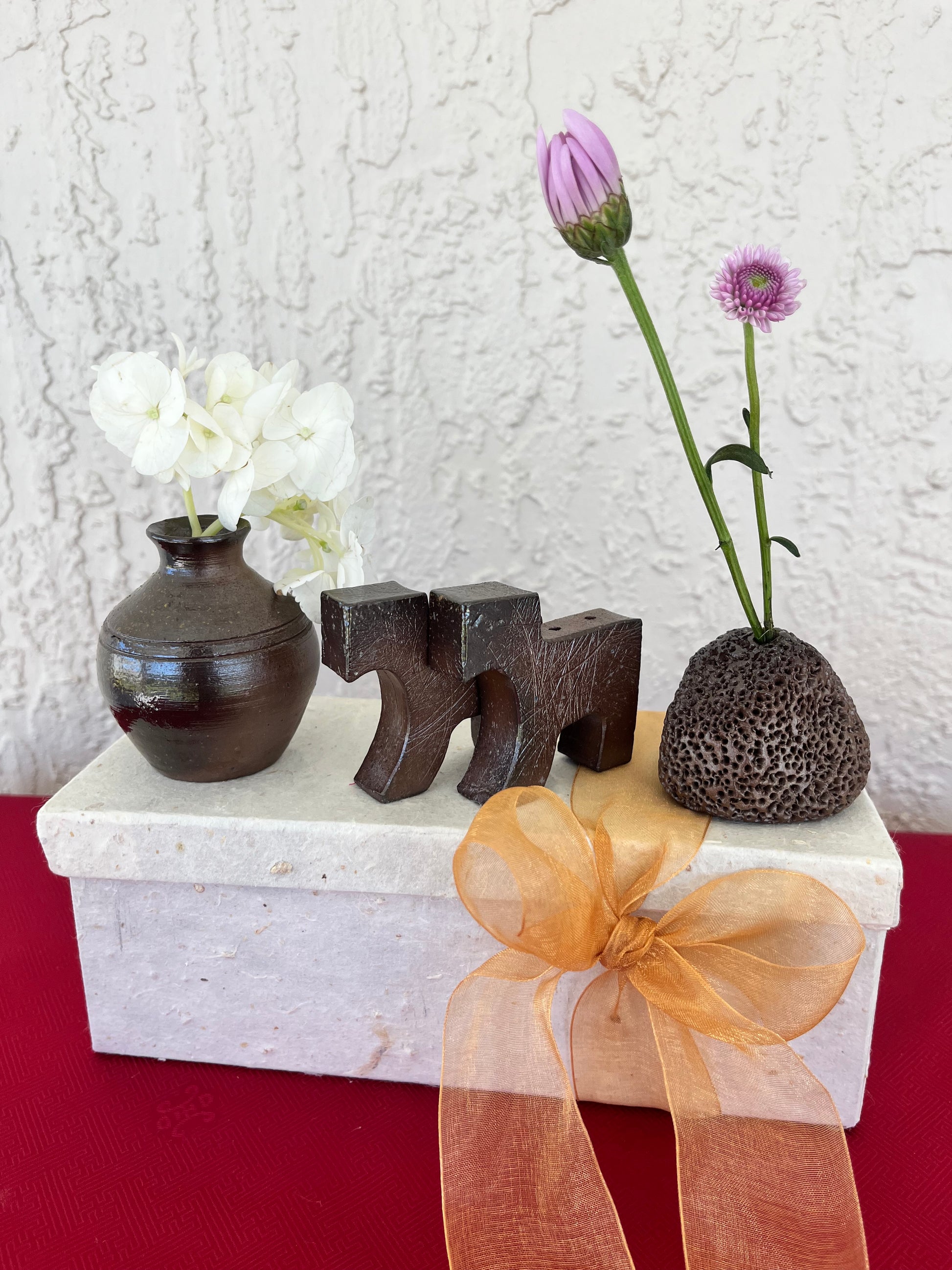 Ceramics handcrafted by the third generation of masters at Jeju Onggi Maeul, one of the only remaining traditionally wood-fired kilns in Korea. This gift set includes three icons from Jeju: the 허벅 (hubuk), a vessel traditionally used for carrying water; Jeju horses; and stone typical to the island's volcanic landscape. Each provides a sweet new landing place for a stem or incense to bring fresh color and scent to your home.