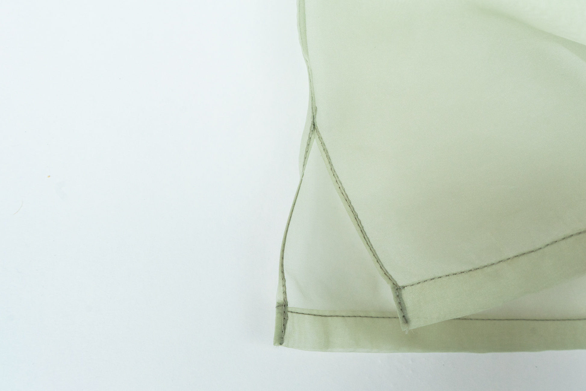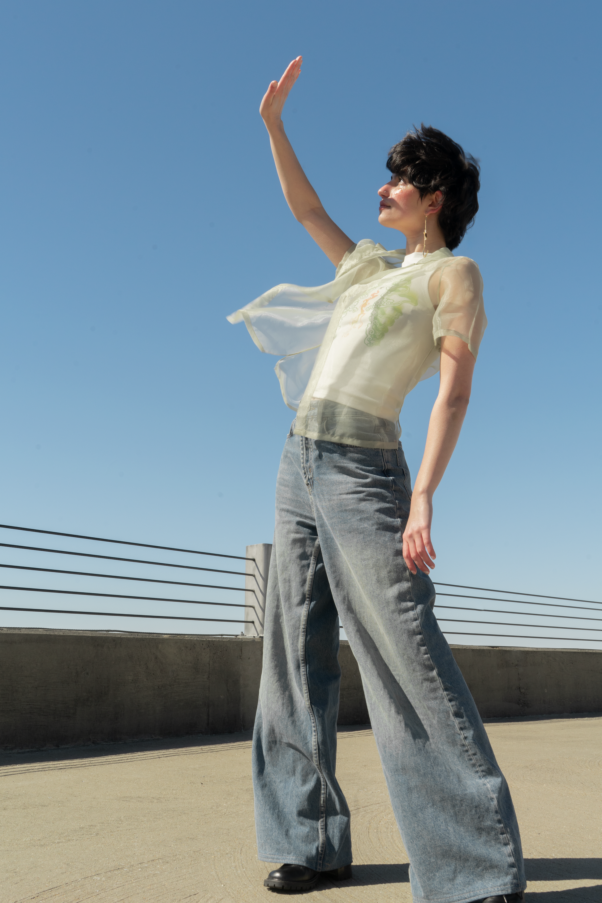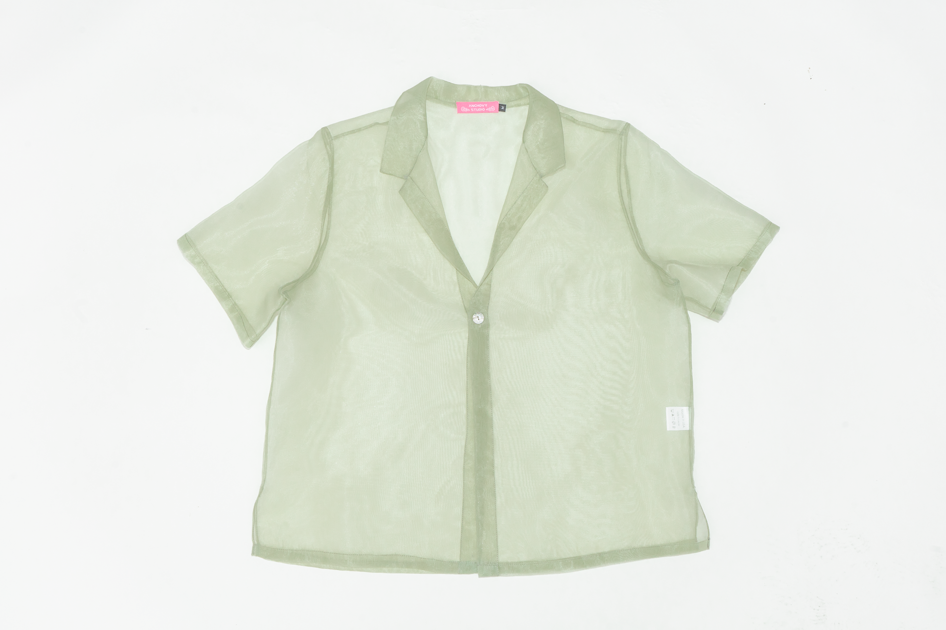 Our button-up, boxy camp collar shirt has a relaxed, slightly oversized fit without compromising clean lines. Side vents for max comfort and flow. Made with 100% deadstock organza and mother-of-pearl button with checkerboard detail. With or without our Cloud Rib print, a lovely sheer layering piece, like wings almost lighter than air.
