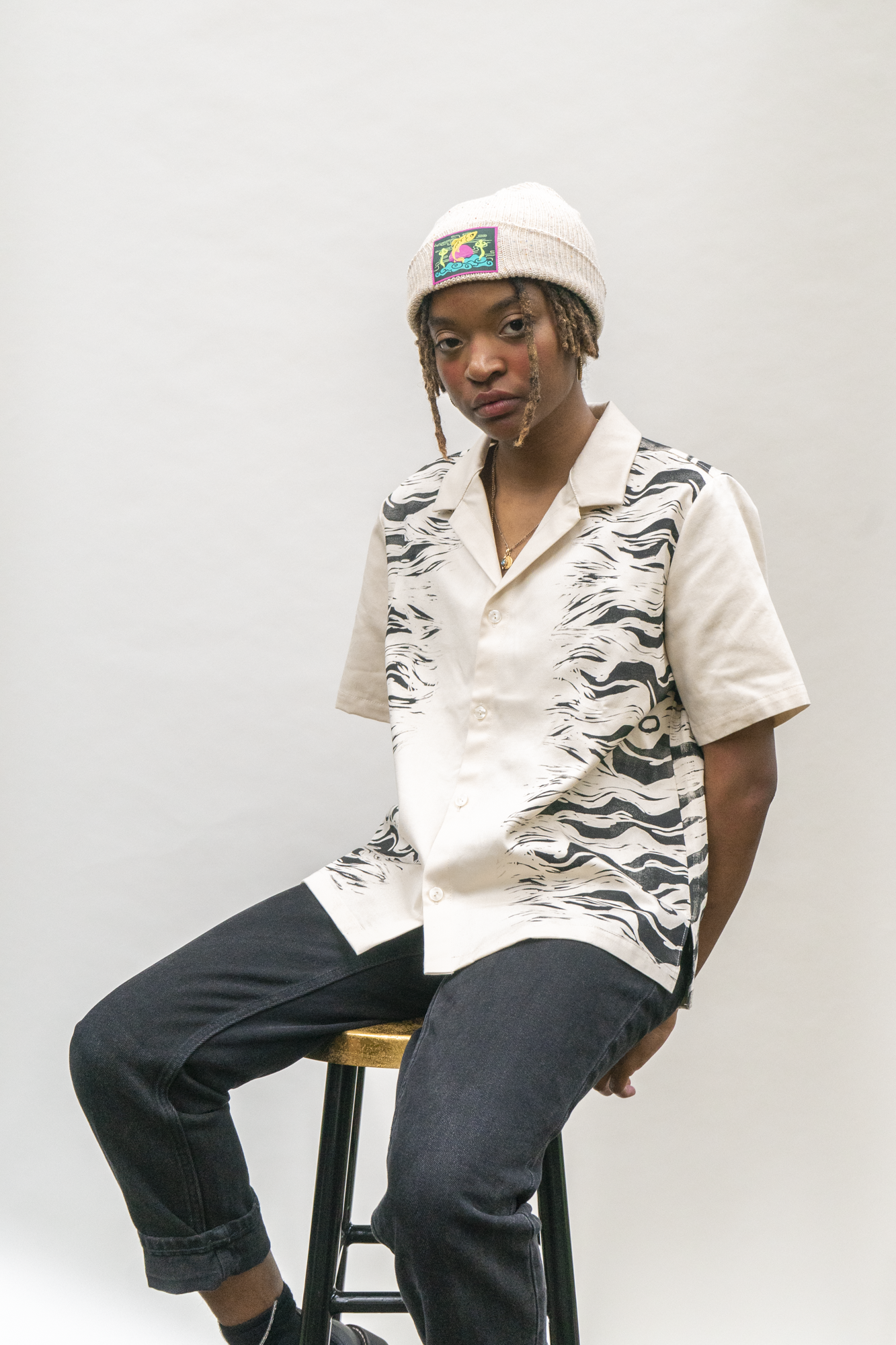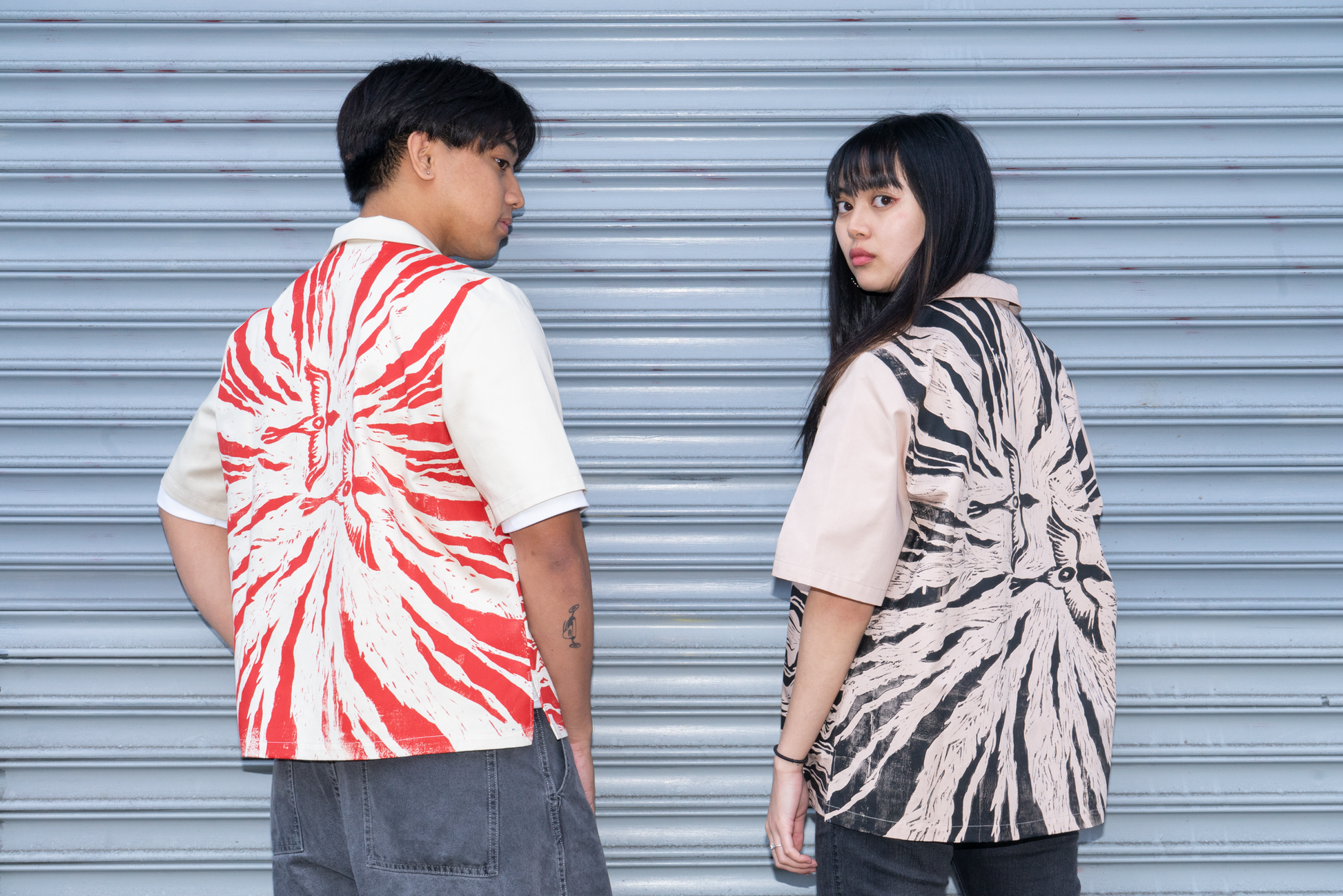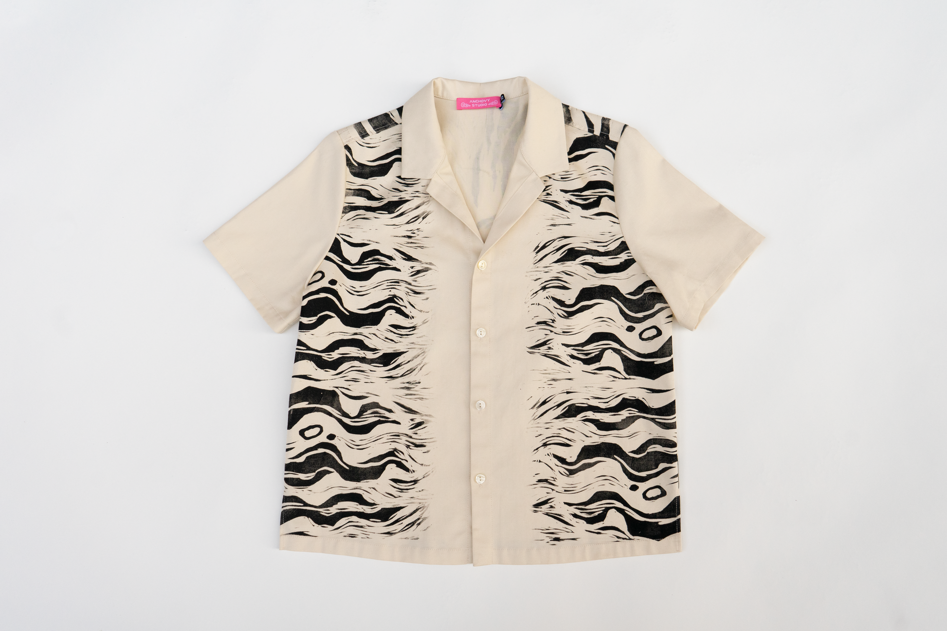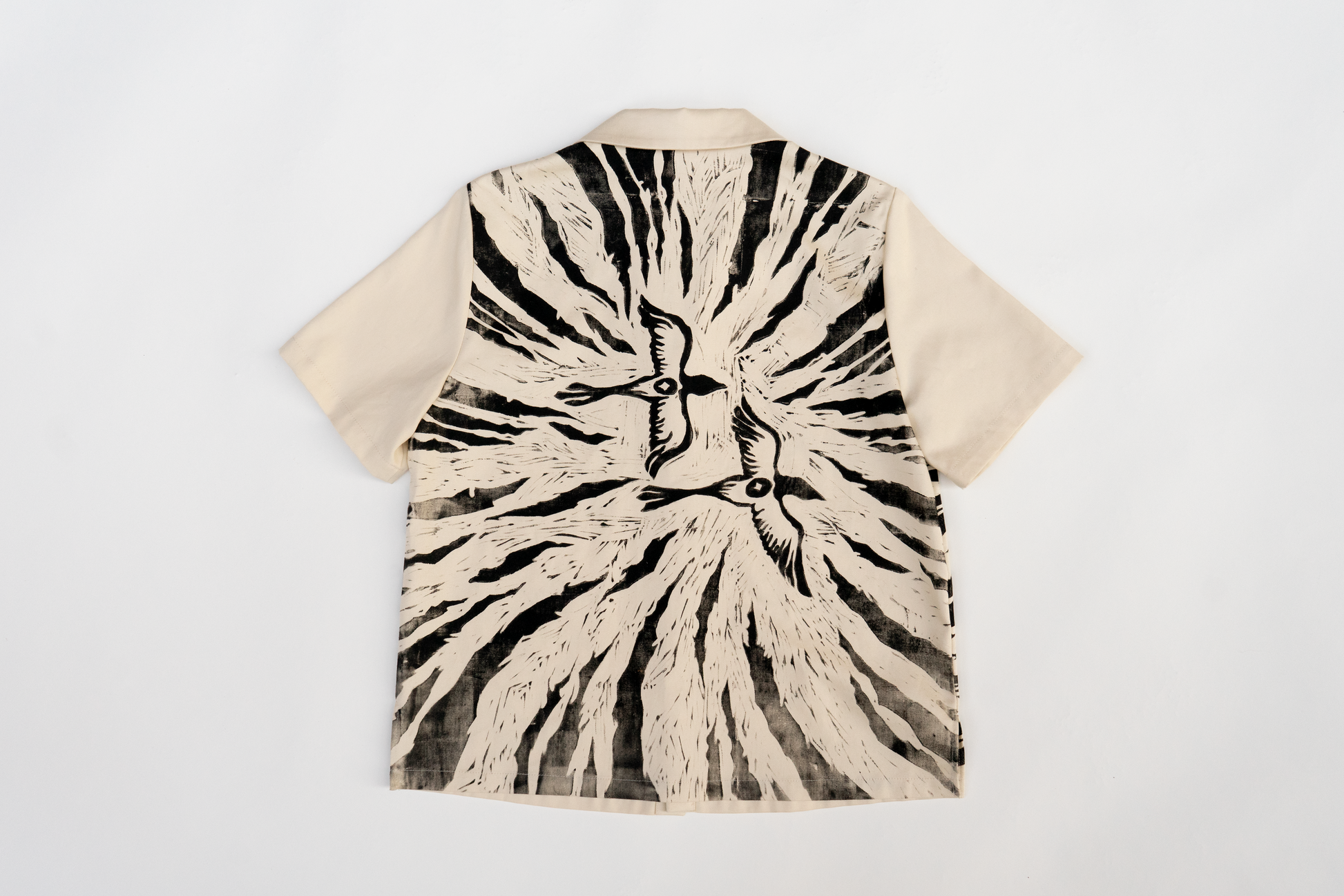 Each smoke & light shirt is one-of-a-kind! We’ve block printed each shirt by hand using a plate that we custom designed and carved just for these garments. Thus each one has a unique appearance and there may be slight variations in the print. Our button-up, boxy camp collar shirt has a relaxed, slightly oversized fit without compromising clean lines.