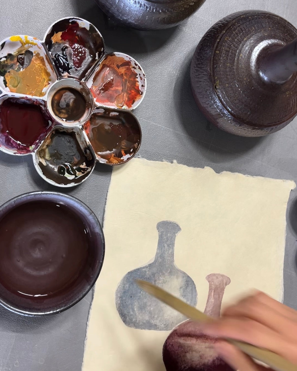 Inspired by our time at Jeju Onggi Maeul, one of the only remaining traditionally wood-fired kilns in Korea still producing handcrafted onggi today. Made from indigenous volcanic soil, Jeju onggi are unglazed, leaving all color variation up to the dance of the flames in the kiln. These traditional vessels for alcohol, though made of the same grey-brown soil, emerged from the kiln gleaming every color from silver-blue to gold to deep wine and magenta.